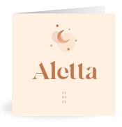 Aletta is een middellange naam en bestaat uit 6 letters. De naam begint met de letter A en is opgebouwd uit 3 klinkers (a, e, a) en 3 medeklinkers (l, t, t).