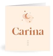 Carina is een middellange naam en bestaat uit 6 letters. De naam begint met de letter C en is opgebouwd uit 3 klinkers (a, i, a) en 3 medeklinkers (c, r, n).