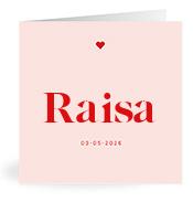 Raisa is een middellange naam en bestaat uit 5 letters. De naam begint met de letter R en is opgebouwd uit 3 klinkers (a, i, a) en 2 medeklinkers (r, s).